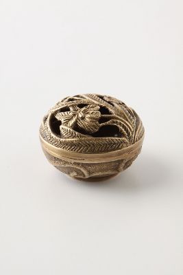 Berkshire Garden trinket dish in the Anthropologie clearance section. It is perfectly re-purposed for burning those little cone incense on a heat resistant surface (so metal heat transfer is not an issue) while the top vents beautifully. I'm so in love with my little ten dollar find!